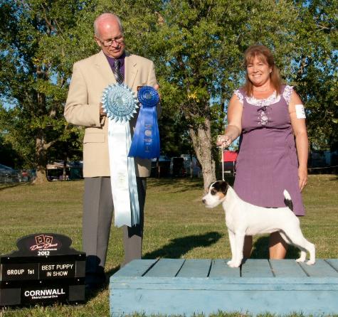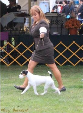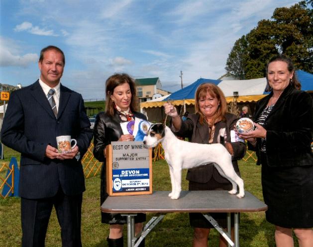 | Tia at the terrier National in the United States in Pennsylvania in October 2012. At Devon, Best Bred-By exhibitor (BBE) and Best of Winners (BOW) good for a 5 points major. Tia has defeated 27 Parsons !! What a start in the USA. |